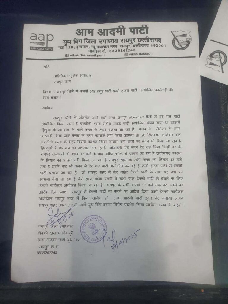 इस पूरे मामले को लेकर रायपुर शहर में चर्चा का माहौल बना हुआ है। अब देखना होगा कि प्रशासन इस चेतावनी को कितनी गंभीरता से लेता है और क्लबों के खिलाफ किस तरह की कार्रवाई करता है। आम आदमी पार्टी ने साफ कर दिया है कि वह समाज में नशे और असंवेदनशीलता को बढ़ावा देने वाले तत्वों के खिलाफ लगातार आंदोलन करती रहेगी।